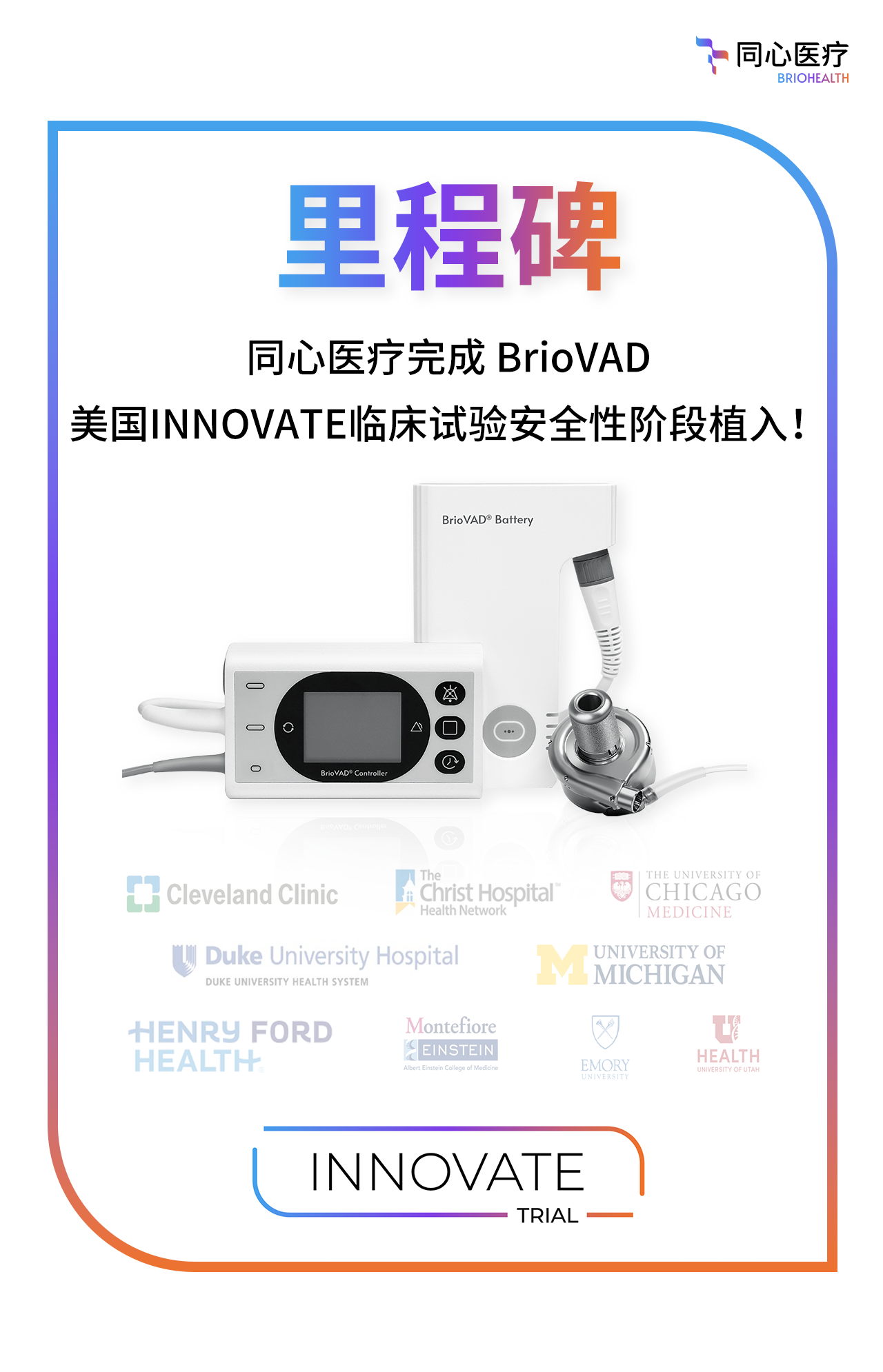 近日,同心医疗全资子公司BrioHealth Solutions, Inc.完成了公司自主研发的全磁悬浮左心室辅助装置BrioVAD美国INNOVATE临床试验安全性阶段的植入工作,实现了又一重要里程碑。这标志着该试验安全性阶段30天随访工作的全面启动,并将在数据收集完成后递交美国食品药品监督管理局(FDA),以便进入确证性阶段。同时,公司正在加速确证性阶段的各项筹备工作;根据INNOVATE临床试验的设计方案,在进入确证性阶段后,入组中心数量允许扩展至60家。