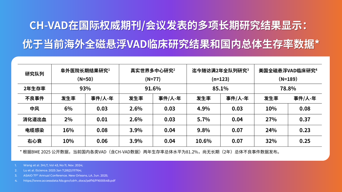在国内商业化的推广过程中,同心医疗深度联动全国顶尖医疗机构,始终坚持以患者为中心,携手构建贯穿植入、管理、随访全生命周期的VAD服务体系,持续推动VAD疗法的规范化与可及性。作为目前唯一持续在国际主流学术平台公布长期临床数据的国产心室辅助装置,CH-VAD多项研究结果显示,其长期临床效果不仅优于国内各类产品的总体生存水平,也优于当前海外全磁悬浮VAD临床研究结果,展现出卓越的产品性能和临床价值。