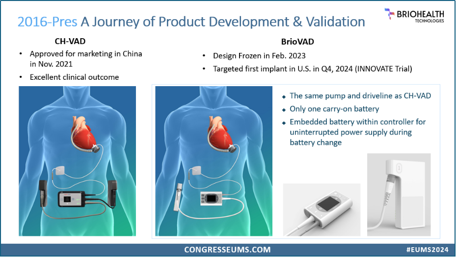 9月11日-14日,第18届欧洲机械循环支持峰会(EUMS)在德国汉诺威成功举行。该峰会是全球晚期心力衰竭领域展示技术创新、设定最佳实践标准和推动多学科诊疗策略的国际领先的学术交流平台。本届峰会旨在突出最佳实践、采用跨学科方法、确保国际视野、鼓励干预策略、促进互动参与及推动创新。同心医疗创始人陈琛博士、临床运营高级副总裁Karl Nelson先生等受邀出席本次会议。 在本次会议的VAD UPDATES环节,陈琛博士报告了同心医疗自主研发的全磁悬浮植入式左心室辅助系统——慈孚®VAD(型号:CH-VAD®)和BrioVAD®的最新研发和临床进展,引发国际社会的广泛关注与高度评价。 图1:陈琛博士在EUMS 2024峰会现场作报告 会上,陈琛博士详细介绍了公司核心产品慈孚®VAD和BiroVAD®的原始创新开发历程(图2、图3),产品于2011年首次样机定型并在美国人工器官学会年会公布,经过数次多学科优化迭代并于2015年最终定型。慈孚®VAD和BiroVAD®在磁悬浮结构、流体力学设计、经皮电缆设计等方面具有多项全球首创技术,并且在血液相容性、血流动力学、植入侵犯性、防感染性、便携可靠性等评价人工心脏的关键性能指标方面显示了国际领先性(图4至图6)。 作为享有国际声誉的磁悬浮VAD专家,陈琛博士在本次会议上重点阐述了全磁悬浮的技术标准。陈琛博士表示,慈孚®VAD和BiroVAD®的设计遵循了被国际上广泛承认的ISO 14839-3机械振动的国际标准,针对配备主动磁悬浮轴承的旋转机械的振动,需进行稳定性的裕度评估;同时,认为在VAD领域需要设定磁悬浮设计的质量标准以消除任意选择,阐释了全磁悬浮血泵的转子应当能够在空气中悬浮并在旋转时能够抵抗倾斜运动。 同时,陈琛博士公布了慈孚®VAD在中国临床推广应用中的主要结果。通过积极推进国际领先的全流程管理和多学科合作理念,在遵循上市后随访监管要求下,截至2024年9月1日,慈孚®VAD在中国累计使用314例。通过采用Kaplan-Meier生存分析,患者1年、2年、3年生存率分别为87.2%、85.2%、82.4%(图8),高于国际大型临床试验及INTERMACS数据水平。患者中风(图9)、消化道出血(图10)、经皮电缆感染(图11)等关键不良事件发生率低于国际大型临床试验及INTERMACS数据水平。 陈琛博士同步介绍了即将启动的BrioVAD®美国INNOVATE临床研究的设计方案和计划,该研究将采用随机对照的方式评估BrioVAD®用于治疗难治性心力衰竭的有效性和安全性。 会议期间,陈琛博士、Karl Nelson先生与国际VAD行业领袖进行了广泛的交流与讨论。 2020年,同心医疗成为首个受邀参加欧洲机械循环辅助峰会的中国植入式VAD企业,此后持续在该会议上报告公司产品研发和应用进展。2021年11月,同心医疗自主研发的慈孚®VAD成为我国首个获批上市的国产人工心脏,标志着我国晚期心衰治疗进入人工心脏时代;2024年2月,BrioVAD®获得美国FDA的IDE批准,成为我国首个获得FDA批准进入临床试验的有源植入式医疗器械。凭借产品在关键性能指标上的国际领先性,同心医疗中美业务相继进入了新的里程碑,这也将进一步加速公司在欧洲及其他海外市场的拓展步伐。